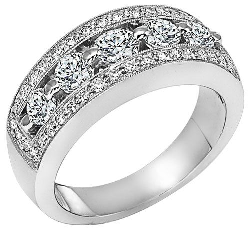 Anniversary ring featuring 5-0.79 cts of Round Brilliants set w/ 38- 0.38 cts. Diamonds all G-H SI2. Finger size 5.