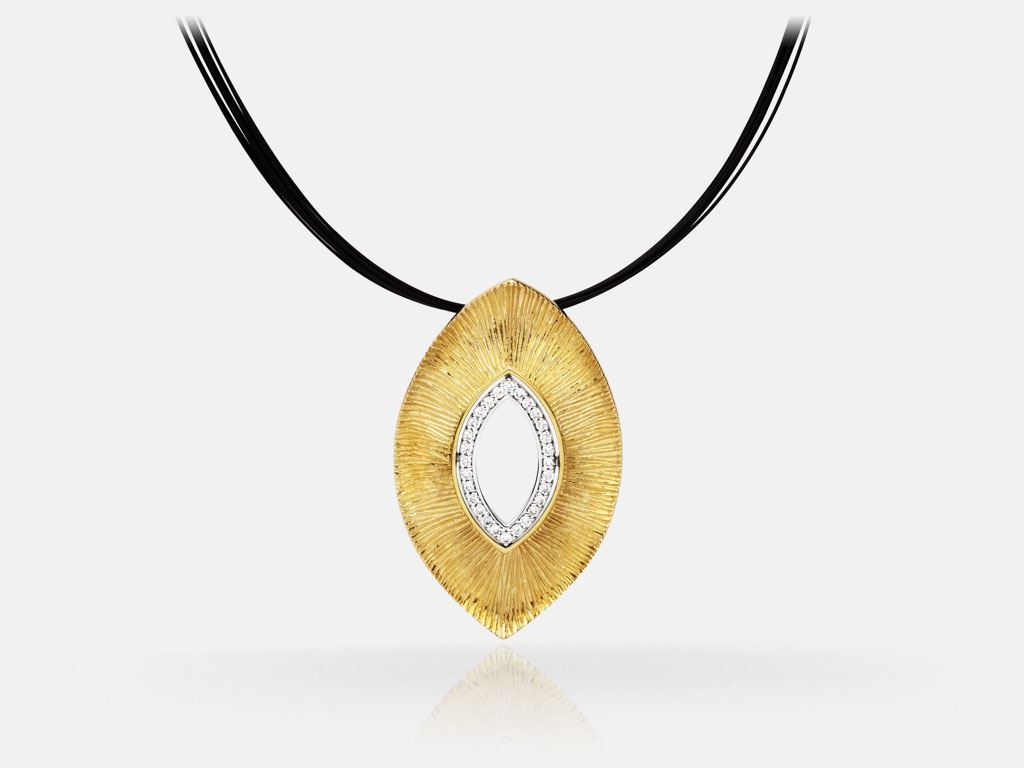14K two tone gold textured shield necklace on a synthetic rubber neck chain set with 0.15 cts of G-H color SI2 clarity round brilliant diamonds.