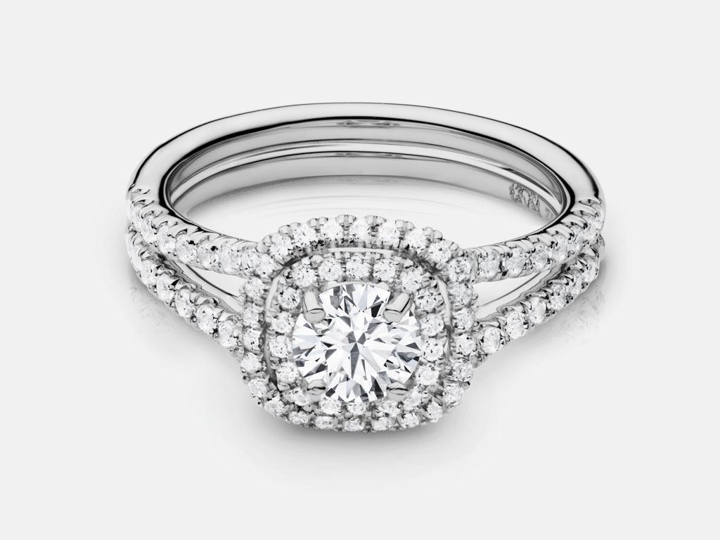 14K White gold engagement ring w/ a split shank & double halo. Featuring a 0.40 cts H VS2 GIA RB. 72- .006cts G-H VS/SI make up the double halo and split shank.