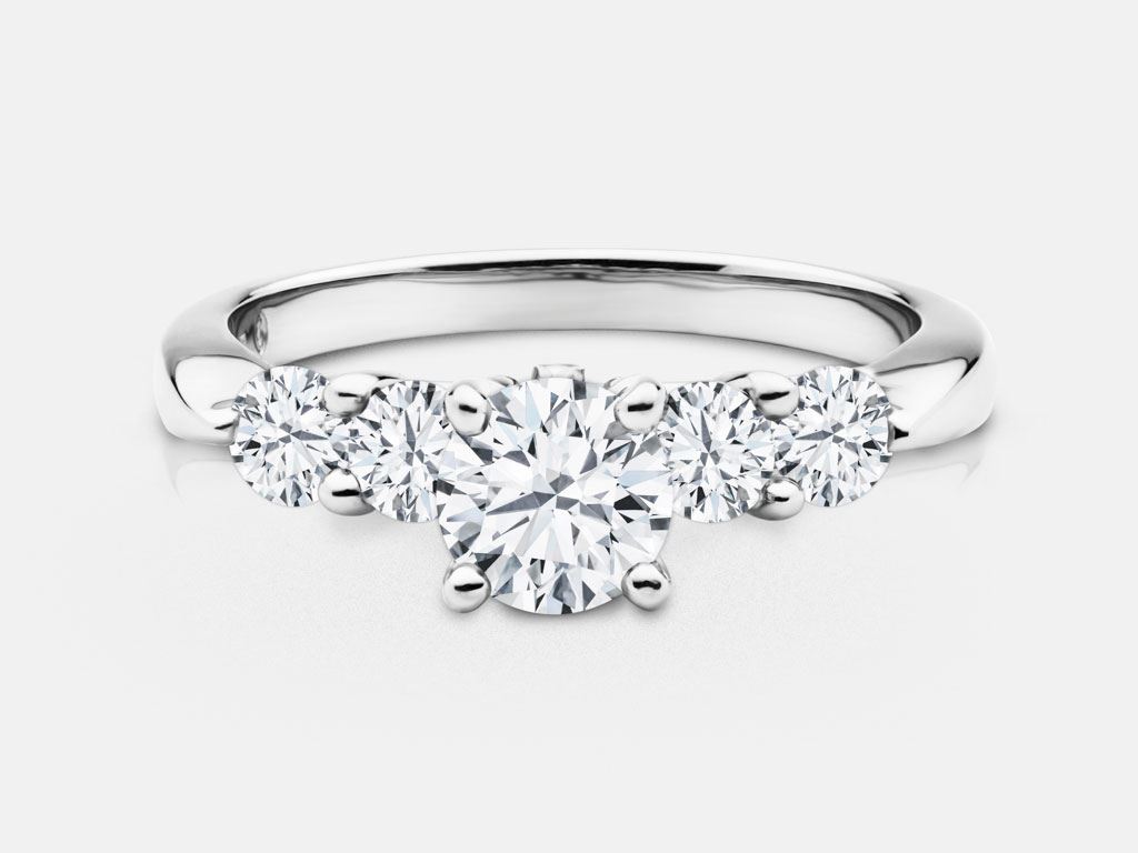 14K White gold engagement ring featuring 1- 0.41 cts K SI2 RB w/ 4 - .08 cts G-H SI diamonds on the shank.