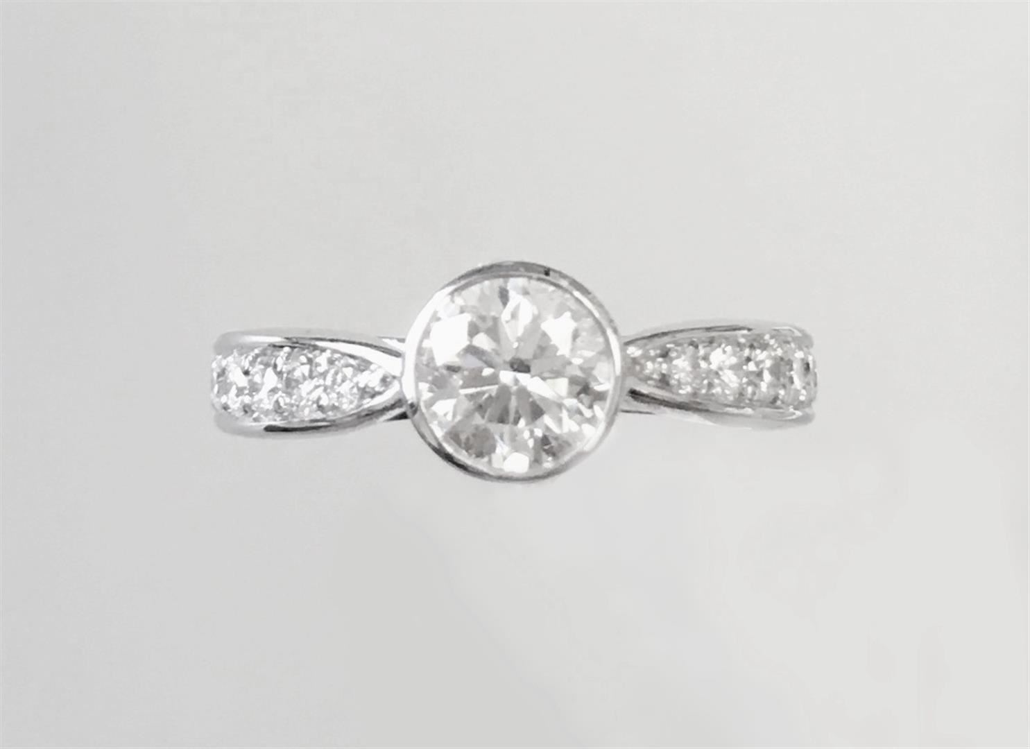 14K White gold engagement ring bezel set w/ diamonds on the shank. Featuring a 0.80 cts J-K SI1 RB set w/ 14-.022 cts G/H SI diamonds on the shank.
