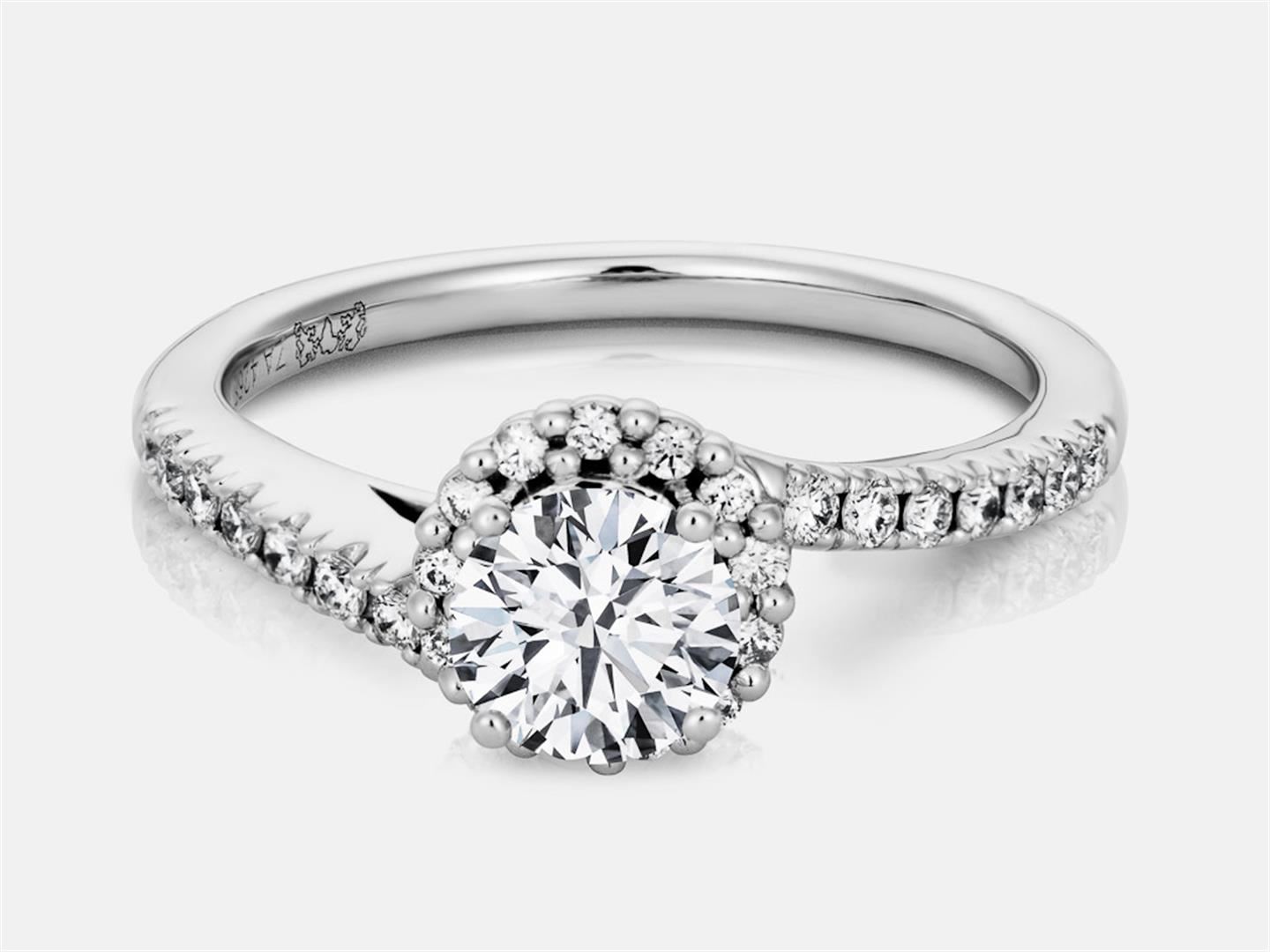 14K White gold engagement ring w/ a halo and diamonds in the shank 1/2. This ring features a 0.43 cts F VS2 GIA round brilliant. 27- 0.025 cts, F VS2 diamonds make up the halo and shank.