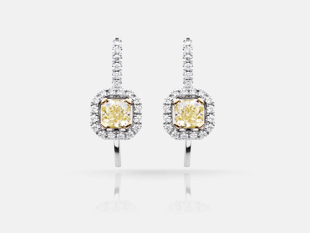 18K TT Framed Halo Style E-Rings. Featuring 2-1.15 cttw Fancy Yellow Radiant cuts set w/ 44-0.45 cts of G-H SI2 quality side diamonds.