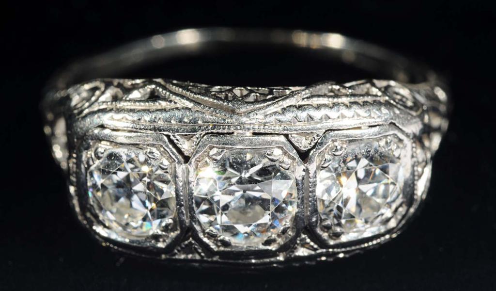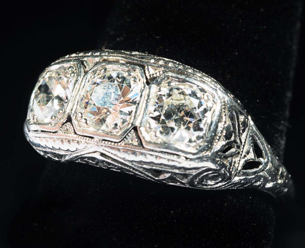 Three brilliant cut diamonds weigh 1.5 carats total. Diamonds are of excellent color and clarity. Filigree setting. Jewelry Condition (Excellent).