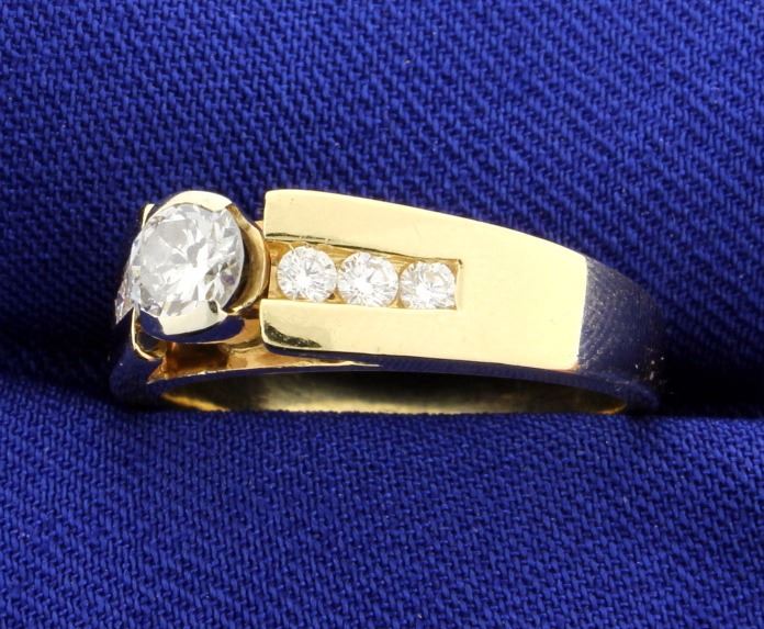 This substantial ring is set in 14k yellow gold with 1/4 carat of small brilliant cut diamonds flanking the sides. The center is a brilliant cut 0.50 carat diamond with I-1 clarity and H color. The 6 smaller brilliant cuts have a VS-2/SI-1 clarity and G-H color. Ring size 6.5. 5.8g