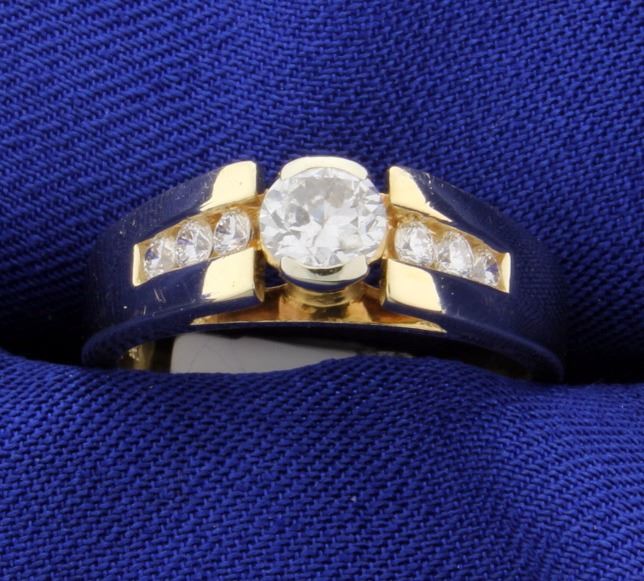 This substantial ring is set in 14k yellow gold with 1/4 carat of small brilliant cut diamonds flanking the sides. The center is a brilliant cut 0.50 carat diamond with I-1 clarity and H color. The 6 smaller brilliant cuts have a VS-2/SI-1 clarity and G-H color. Ring size 6.5. 5.8g