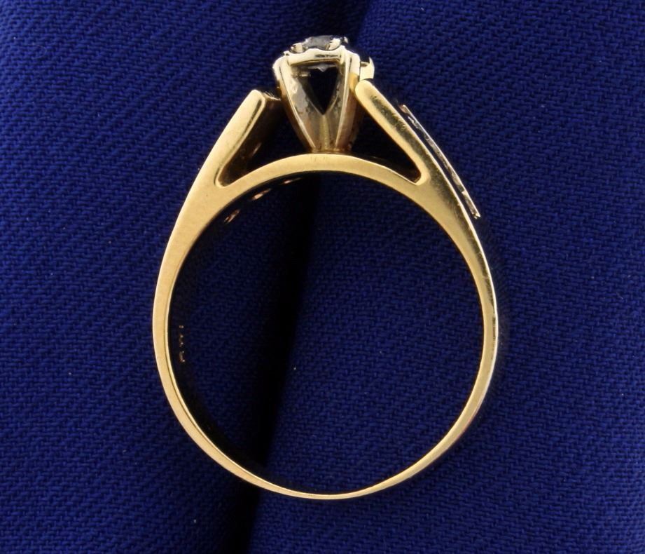 In 14k gold, center diamond is high quality .1 ct surrounded by six .01 ct diamonds, all I clarity/J color. The ring is 7mm wide and tapers to 3.6mm. Size 7.5. 6.2g