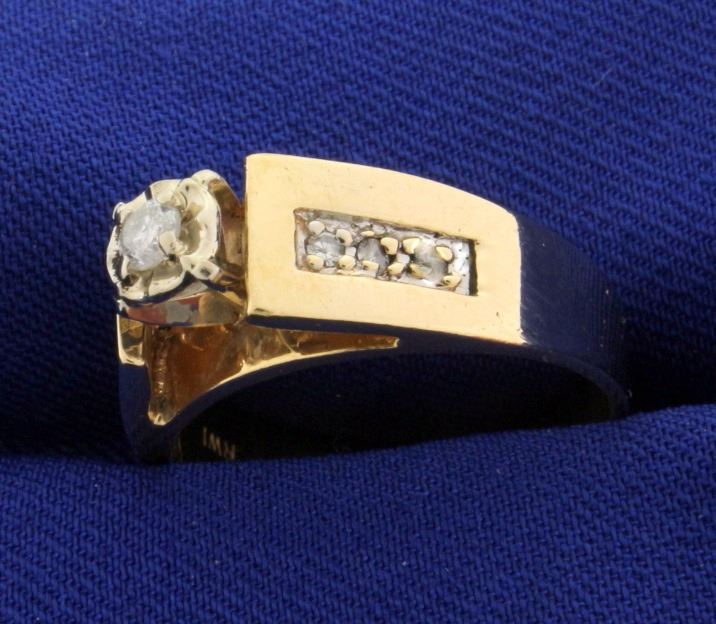 In 14k gold, center diamond is high quality .1 ct surrounded by six .01 ct diamonds, all I clarity/J color. The ring is 7mm wide and tapers to 3.6mm. Size 7.5. 6.2g