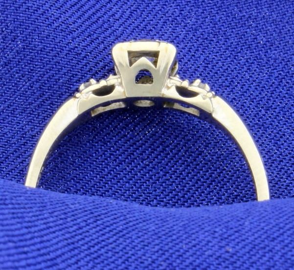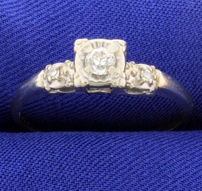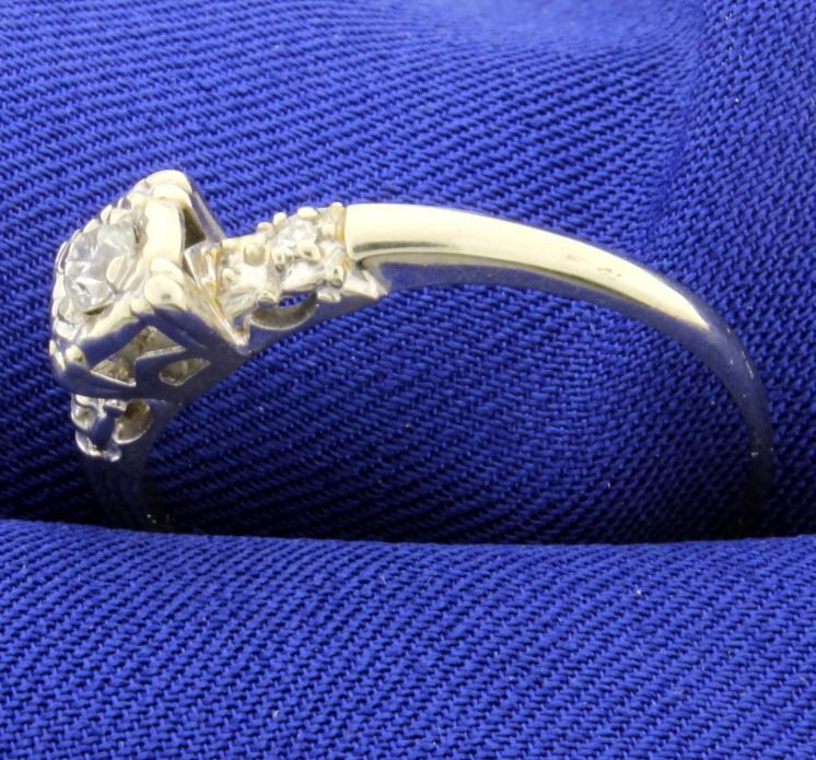 14K white gold, the center stone is .15ct diamond, surrounded by two .01ct diamonds SI clarity, H color. Size 12 2.9g