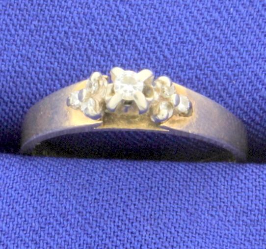 In 10K yellow gold it contains one .04ct diamond & six 1/2 point diamonds-all with SI clarity & I color. Size 5 2.2g