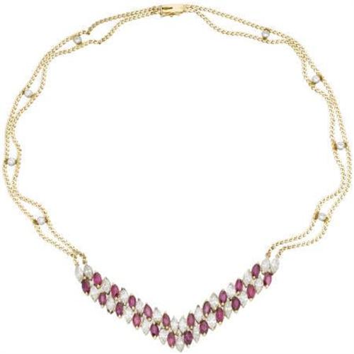 <B>Diamond, Ruby, Gold Necklace</B></I><BR><BR>The necklace features marquise-shaped diamonds weighing a total of approximately 6.25 carats, enhanced by marquise-shaped rubies weighing a total of approximately 7.70 carats, suspending from two curb chains accented by full-cut diamonds, set in 14k yellow gold. Total diamond weight is approximately 6.85 carats. Gross weight 21.20 grams. <BR><I>Length: 15-1/2 inches</B></I> <B>Condition Report:</B> Good condition.<BR>Diamonds are I1-I2 clarity / I-J color<BR><BR><b>Shipping:</b> Miscellaneous Collectibles, Smal (<a target="_blank" href="http://www.heritageauctions.com/common/shipping.php">view shipping information</a>)