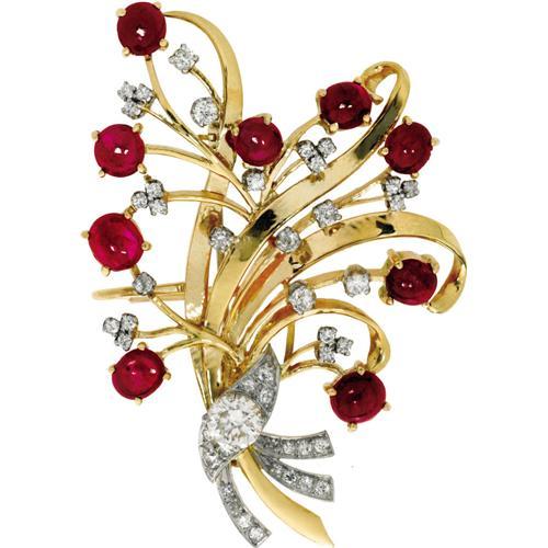 <B>Diamond, Ruby, Gold Pendant-Brooch</B></I><BR><BR>The pendant-brooch features European, full and single-cut diamonds weighing a total of approximately 1.65 carats, set in 14k white gold, enhanced by oval-shaped ruby cabochons, set in 14k yellow gold. A pinstem, catch and pendant bail complete the reverse. Gross weight 21.50 grams.<BR><I>Dimensions: 2-1/2 inches x 1-1/2 inches</B></I> <B>Condition Report:</B> Brooch/Pendant<BR><BR>Diamonds<BR><BR>Average Color: GHI<BR><BR>Average Clarity: SI<BR><BR>Shapes: Round<BR><BR>Diamond Count: 26-50<BR><BR>Colored Gemstones: Ruby<BR><BR>Average Clarity: Fine<BR><BR>Shapes: Oval<BR><BR>Gemstone Count: 1-25<BR><BR>Notes: Very good condition, Circa 1950. Rubies are clear, bright and lively - some rubies display surface reaching inclusions.<BR>Largest diamond weighs approximately 0.85 carat. Brooch is versatile; can be worn as a brooch or pendant.<BR><BR><BR><BR><b>Shipping:</b> Miscellaneous Collectibles, Smal (<a target="_blank" href="http://www.heritageauctions.com/common/shipping.php">view shipping information</a>)
