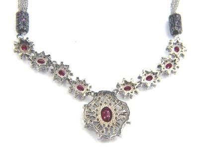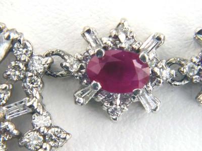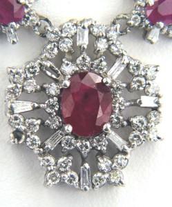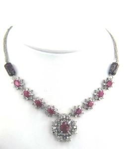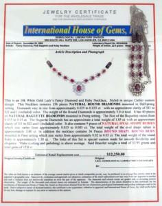 Diamond and Ruby NecklaceThe total weight of necklace is 22.3 grams.The total diamond weight is 11.95 cts, approxmiately. I color SI1 clarity.The size of pendant: 4mm thick .The necklace is 16" long.