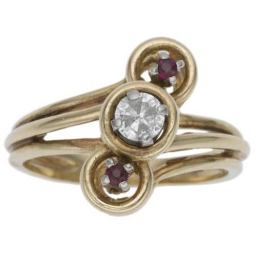<B>Diamond, Ruby Ring</B></I><BR><BR>The ring centers a full-cut diamond weighing approximately 0.20 carat, enhanced by round-cut rubies weighing a total of approximately 0.05 carat, set in 14k yellow gold. Gross weight 3.00 grams. <BR>*Note: Size 4-1/2 (sizeable) <B>Condition Report:</B> Good condition.<BR>Gems are set high.<BR><BR><b>Shipping:</b> Miscellaneous Collectibles, Smal (<a target="_blank" href="http://www.heritageauctions.com/common/shipping.php">view shipping information</a>)