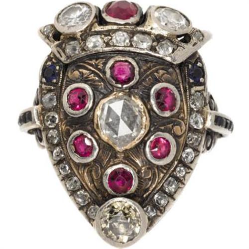 <B>Diamond, Ruby, Sapphire, Silver-Topped Gold Ring</B></I><BR><BR>The ring, designed as a shield, centers a rose-cut diamond, encircled by round-cut rubies, framed by single-cut diamonds, enhanced by full and European-cut diamonds, further enhanced by an oval-shaped ruby, accented by baguette and round-cut sapphires, set in silver-topped 14k gold. Total diamond weight is approximately 2.50 carats. Gross weight 10.10 grams.<BR>*Note: Size 7-1/2 (sizeable)<BR><BR><b>Shipping:</b> Miscellaneous Collectibles, Smal (<a target="_blank" href="http://www.heritageauctions.com/common/shipping.php">view shipping information</a>)