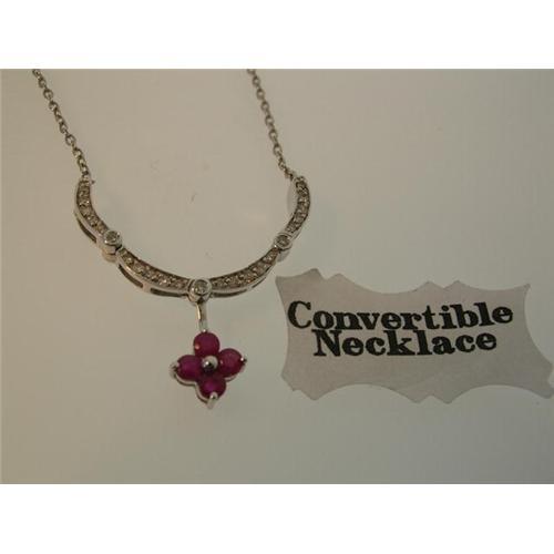 Wonderful Diamond and ruby convertible necklace. TWO necklaces in one! 14Kt white gold ruby and diamond necklace. Rubies is approx. .60 TCW. Diamonds is TCW is .30. The first picture is with the necklace in the open position. Here the necklace measures 17.5" long. The Ruby flower secion hangs down in the front. To convert the necklace to a closed pendant position reverse necklace and then wrap the hinged diamond sections around the center ruby flower and necklace will click at top with magnets. The "pendant" necklace in the closed position measures 16" long. This is a wonderful find! (Very reminiscent of the convertible pins of the 1930's and 1940's, with the idea of getting 2 different looks for the price of one, but this one is a necklace!)Don't miss this one, I don't know if I will ever find another!