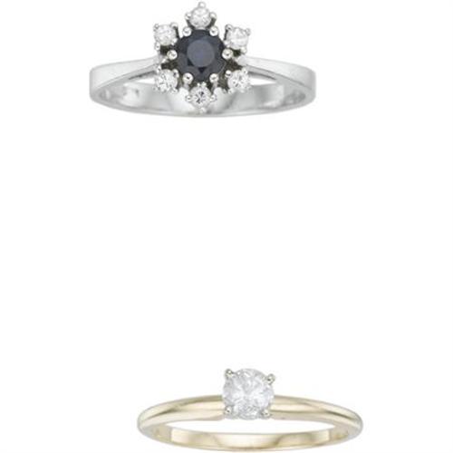 <B>Diamond, Sapphire, Gold Ring Lot</B></I> The lot includes: one ring featuring a solitaire round brilliant-cut diamond measuring 4.31 - 4.29 x 3.00 mm and weighing approximately 0.30 carat, set in 14k yellow gold with a rhodium finished accent <I>(Size 6-1/4)</B></I>; together with one ring featuring a round-cut sapphire weighing approximately 0.35 carat, enhanced by full-cut diamonds weighing a total of approximately 0.15 carat, set in 14k white gold <I>(Size 7-1/4)</B></I>. Gross weight for the lot is 4.60 grams. <BR><BR><b>Shipping:</b> Miscellaneous Collectibles, Smal (<a target="_blank" href="http://www.heritageauctions.com/common/shipping.php">view shipping information</a>)