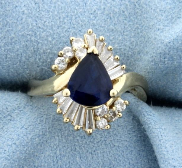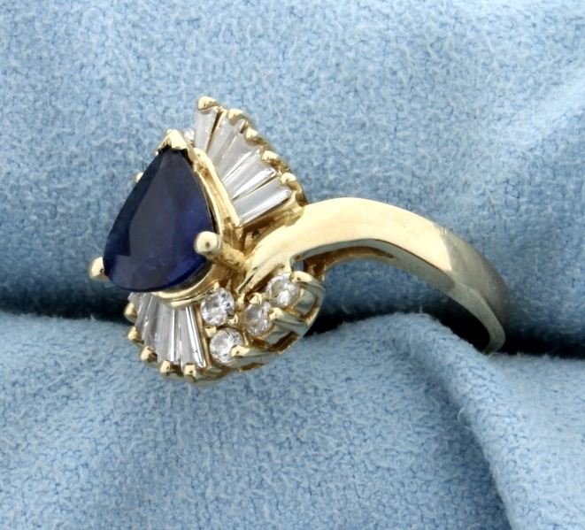 The ring is 14K yellow gold, and contains a 1ct natural pear shaped sapphire with excellent color & clarity. Surrounded by 1ct total weight of high quality baguette and round diamonds that are G color/SI clarity. Size 6 1/4 5.0g