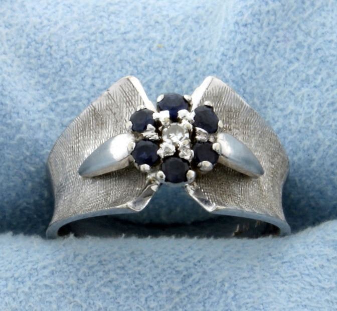 In 14K white gold this ring contains a .05ct diamond surrounded by six 2mm natural sapphires. Size 6 4.8g