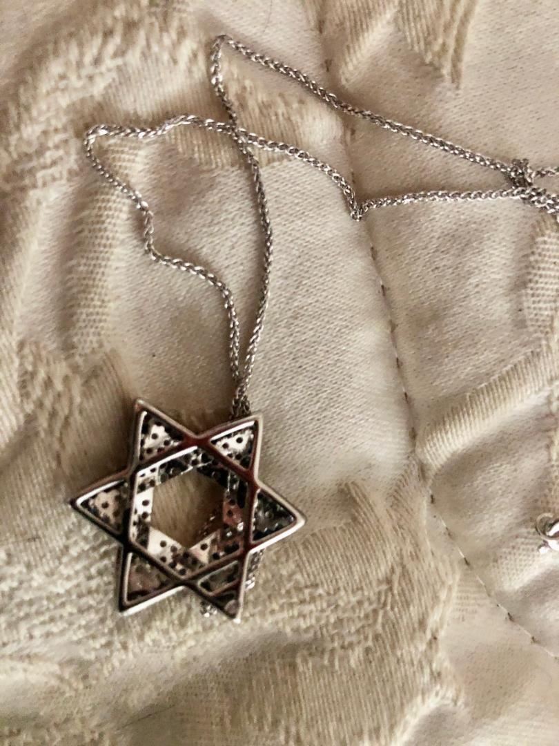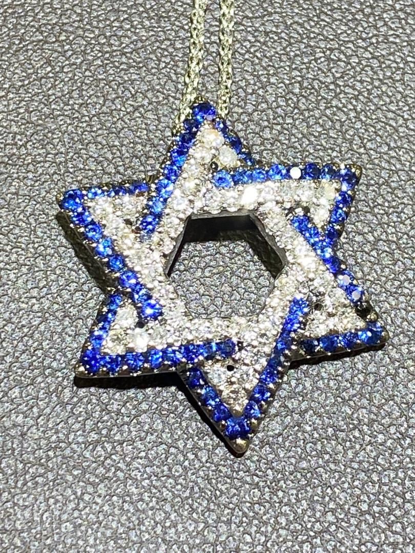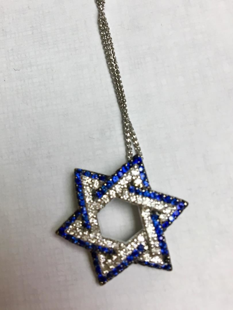 A custom designed Star of David on a 14k white gold backing w/ white gold 16" chain .Comprised of 64 small diamonds & 64 small sapphires .The star measures 1.25" across . 8.6 grams total weight