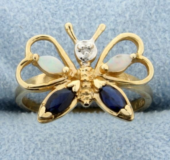 14k White and Yellow Gold. Two 4mm opals. Two 5mm Sapphires. .01ct Diamond. Size 6. 2.9g