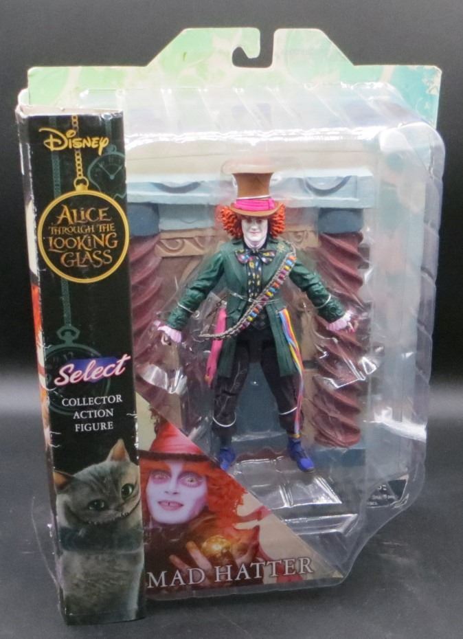Diamond Select Alice Through the Looking Glass Mad Hatter in Green& nbsp;Coat Figure features approximately 16 points of articulation and is 7" in height. Comes with a diorama background depicting a building from Wonderland.