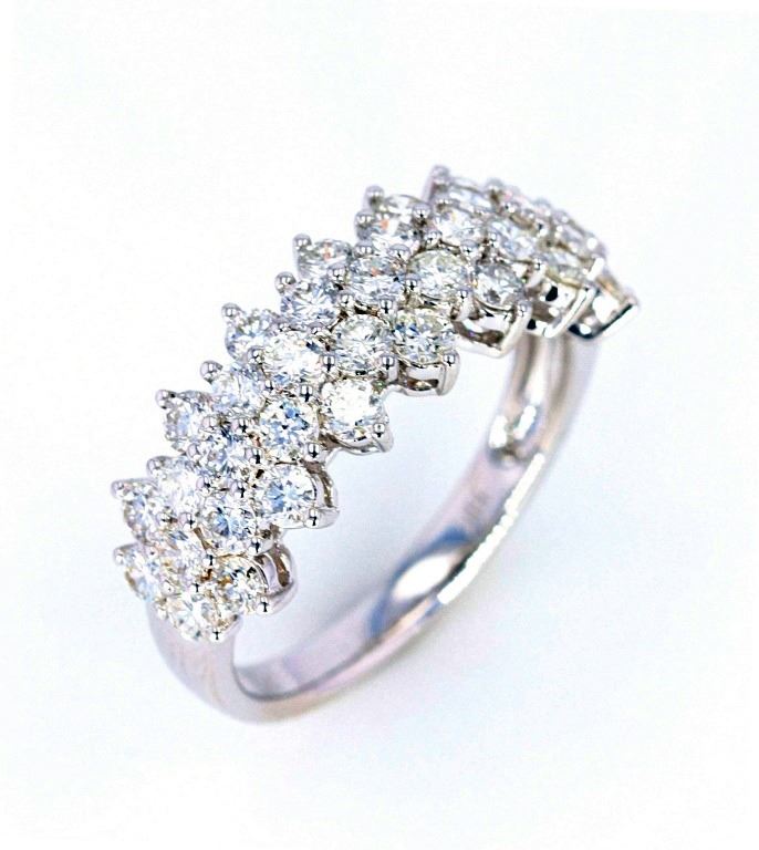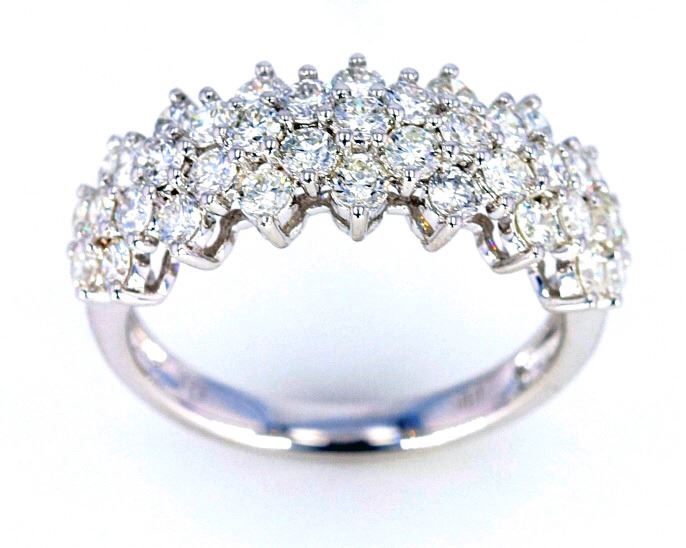 The lot features a brand-new 18K Gold ring set with natural Diamonds. The ring shows a polished 18K white gold band with artful multi-cluster prong set natural diamonds totaling 37 round brilliant cut stones with a weight of 1.68 carats. The diamonds shown here have a wonderful brilliance and sheen with nice eye clarity. The ring is hallmarked CJ 18K and shows 3.79 grams of 18 karat white gold in a size 7 US.