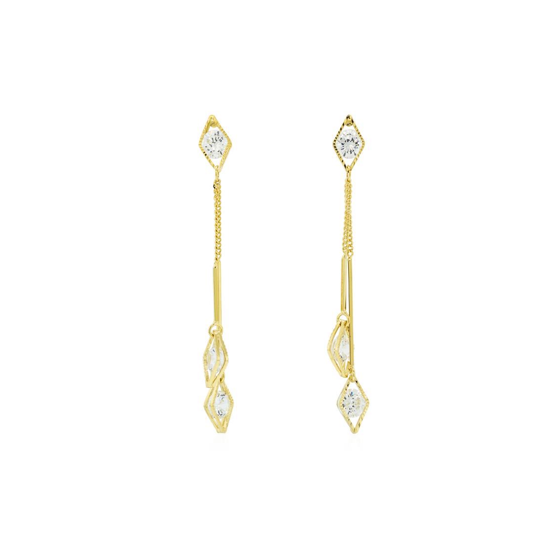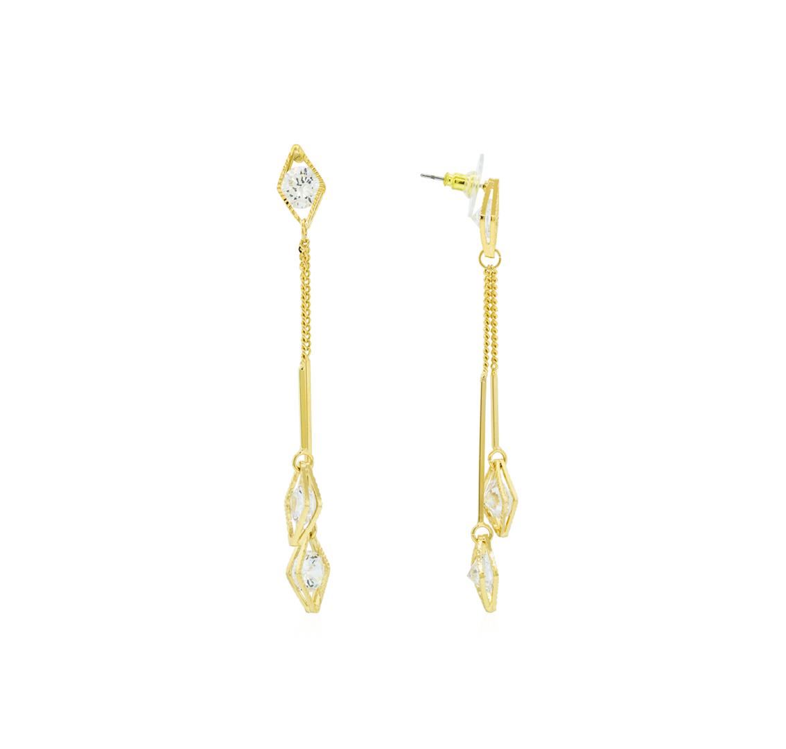 High end designer jewelry. Diamond Shaped Detail Earrings - Gold Plated. Gold Plated Post Set. Clear/ Gold. 2.25"Dangle.