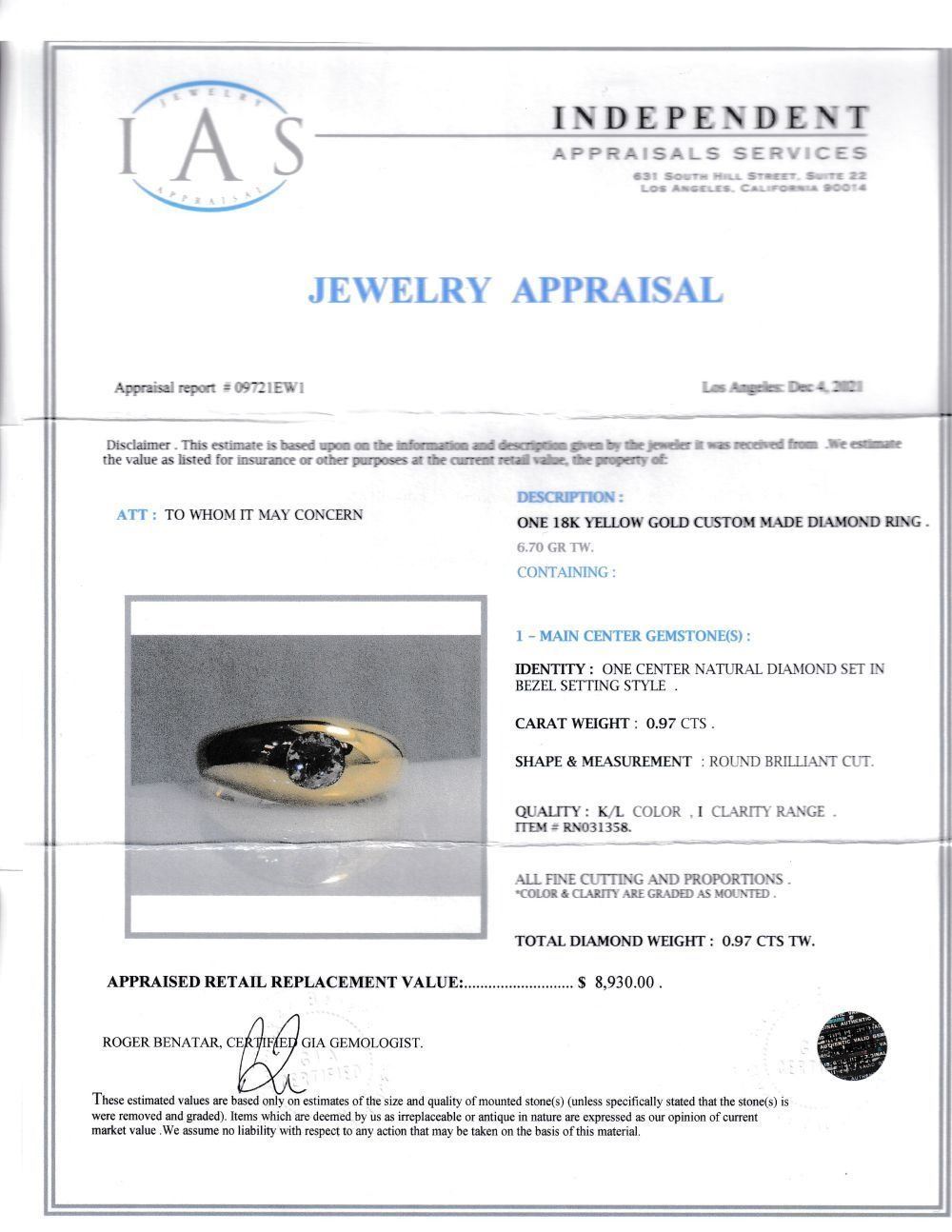 & nbsp;APPRAISAL DETAILS: This ring is certified and appraised for $8,930.00 estimated retail replacement value by Independent Appraisals Services (IAS).