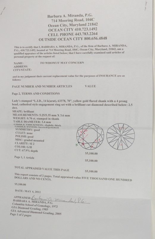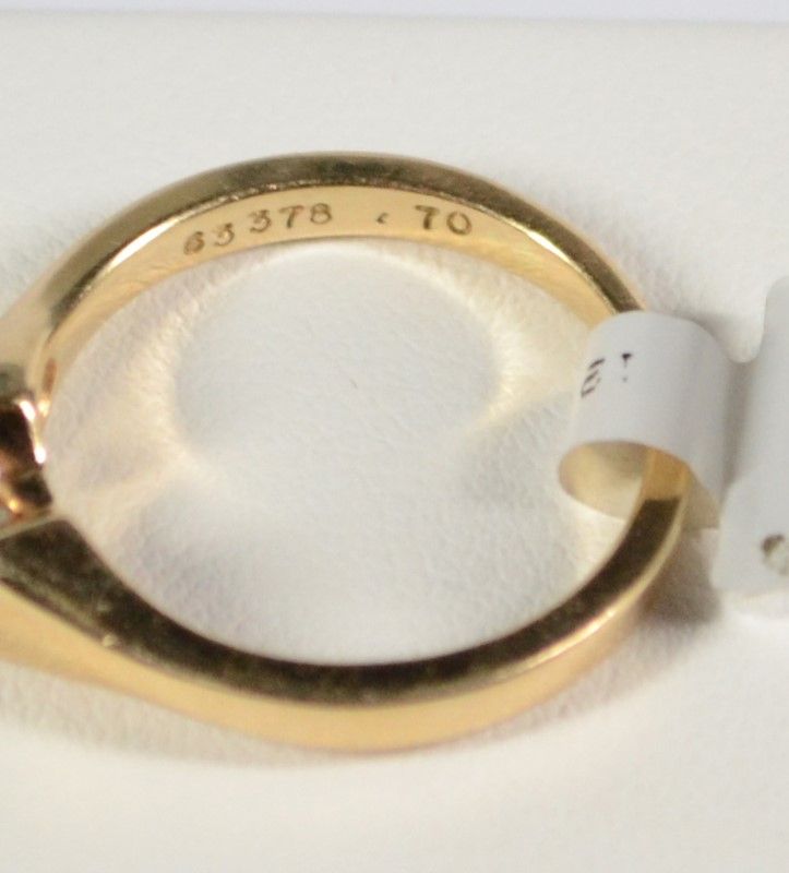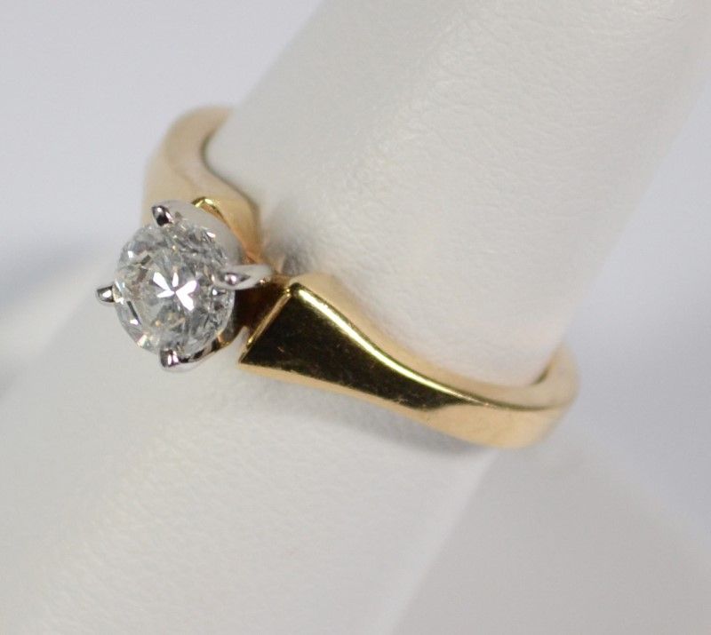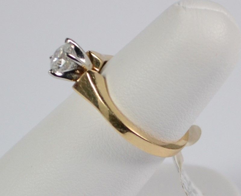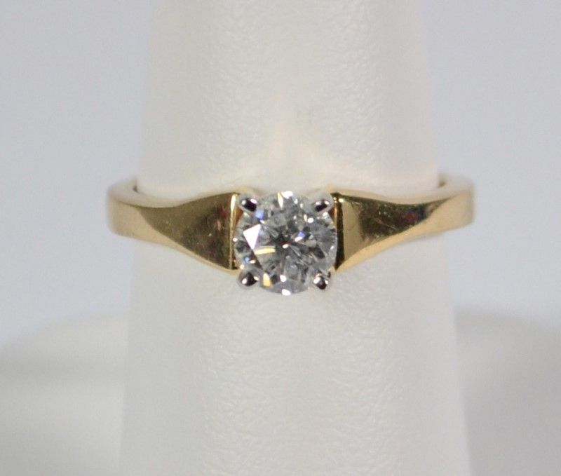 Lady's stamped 14K Yellow Gold Ring. Flared Shank with a 4 ring head, cathedral style engagement ring set with a brilliant cut diamond weighing .70 CT. Ring is a size 6.5. Appraisal that accompanies this ring estimates the replacement value at $5,100.00.