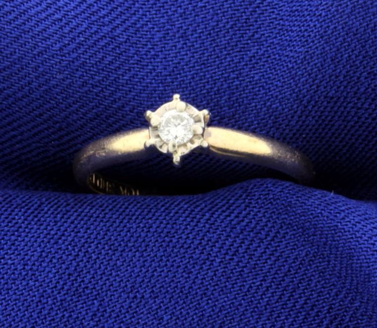 The ring is 10K yellow & white gold and contains a .1ct diamond SI clarity/G color. The ring is a size 7. 1.8g