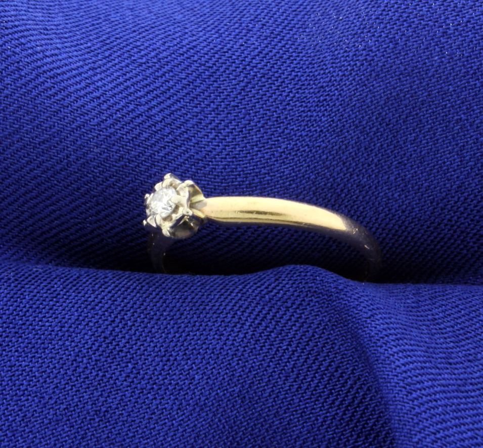 The ring is 10K yellow & white gold and contains a .1ct diamond SI clarity/G color. The ring is a size 7. 1.8g