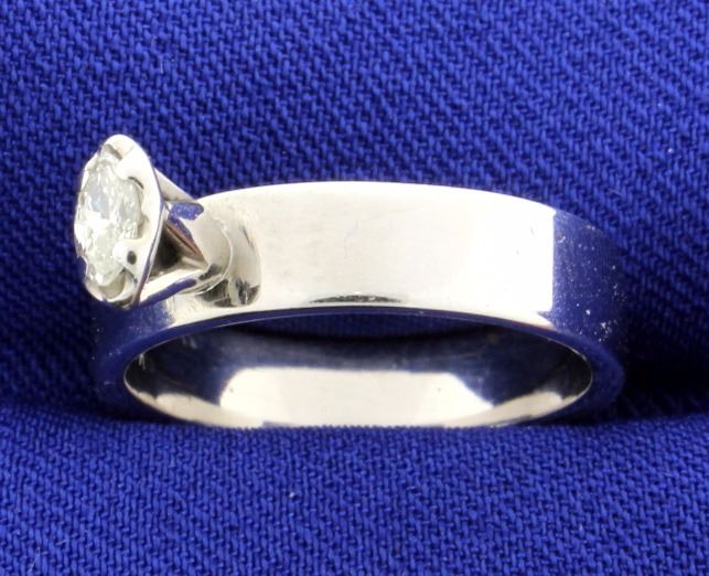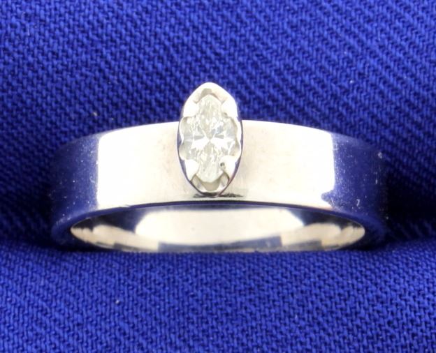 This beautiful 1/5 carat diamond marquise is set in a wide 4.75mm 14k white gold solitaire band mounting. The diamond is SI clarity and I color. Size 6 3/4 5.0g