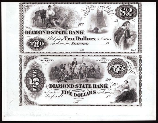 Seaford, Sussex County, Delaware, 18xx (ca. 1850-60's), $2-$5, DE-50-G4a-G8a, Black and white proprietary proof uncut sheet of 2, the $2 note with harvesting corn scene, boat with sail and sailor, the $5 note with seated woman by seashore with anchor and numeral 5 and Washington on horseback on top, both are Choice to Gem Uncirculated, ABNC. (ABN Commemoratives, AIA XI, May 15, 2012)