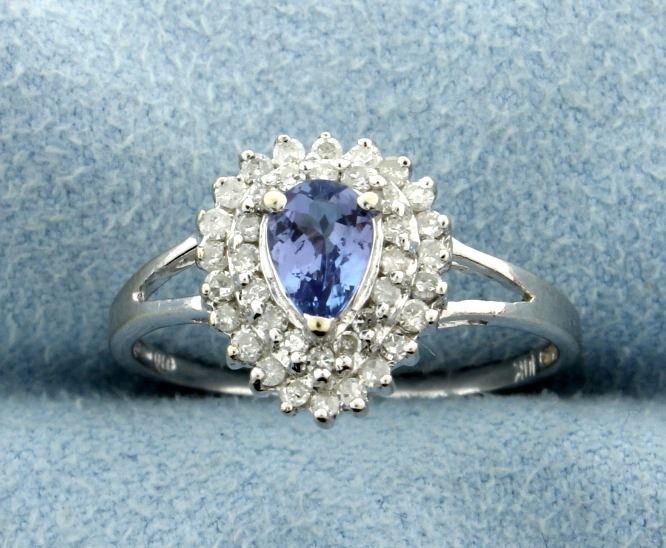 The gem quality tanzanite is a pear shape 4mm x 6mm approx. weight 0.50cts. There are 41 diamonds weighing 1/2 carat. Clarity is I1-I2 and color H-I. Size 7. 2.0g