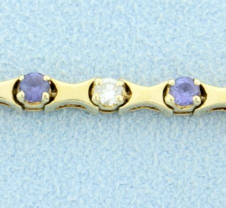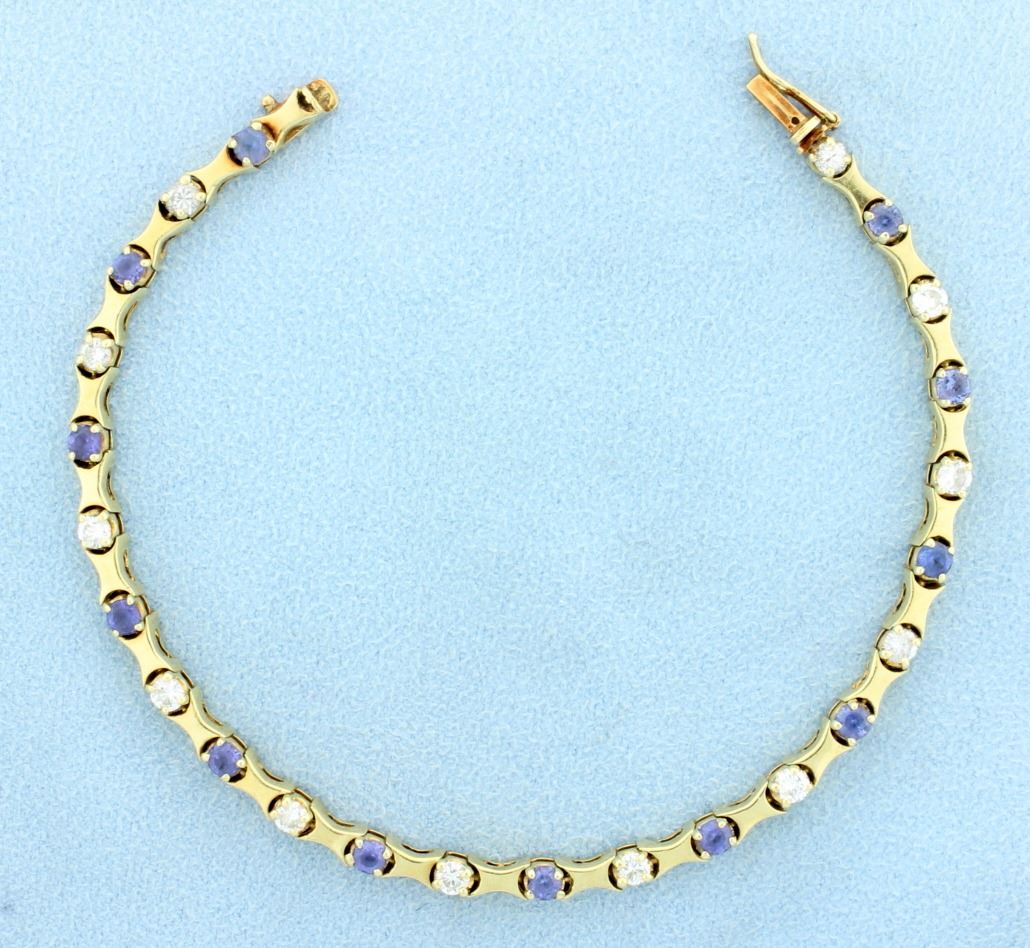 In 14K yellow gold, there are twelve high quality .09ct diamonds-SI clarity, G color. Twelve high quality 3mm round natural tanzanite gemstones-great color & clarity. It is 7 1/8 inches long with safety clasp. 11.6g