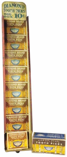 Diamond Toothpicks Tin Store Display. Comes with one large box and one box for display. Age discoloration and rust. 4 X 24 X 1 3/4 inches.