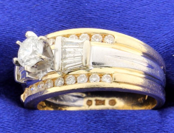 Fantastic 1 carat diamond tutone ring, 14k white and yellow gold. The center brilliant cut diamond is 0.44 carats, I2 clarity and H color. There are 6 tapered baguettes that total 0.26 carats, I1 clarity and H color. The 20 round brilliant cuts diamonds are I1 clarity and H-I color and weigh a total of 0.30 carats. Size 7 6.8g