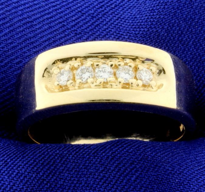 In 14k yellow gold. Contains 5 high quality brilliant cut diamonds that weigh 1/4 of a carat. The diamonds are SI-clarity and H Color. Size 10 1/2. 9.7g
