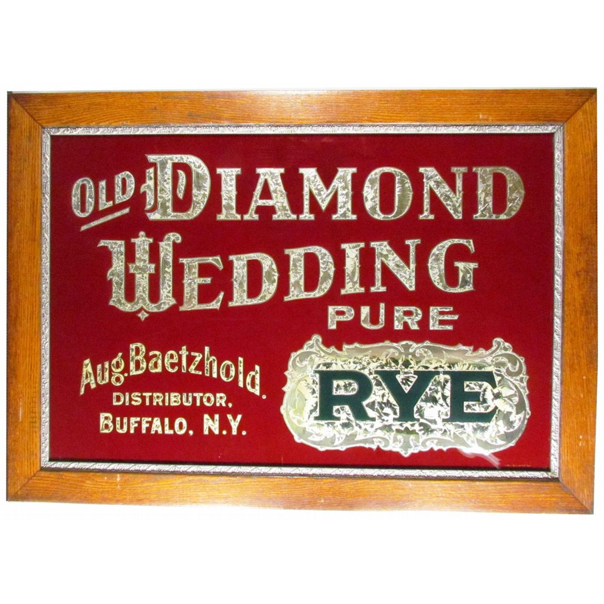 Diamond Wedding Pure Rye Reverse Glass Sign. Aug. Baetzhold Distributor, Buffalo, NY. Glue chip lettering filled with gold and silver leaf. Made by Cincinnati Sand Blasting Co. All original frame and backing. Excellent condition. 42 X 30 inches overall.
