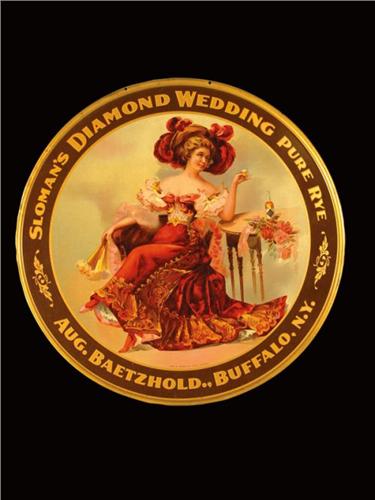 Slomans Diamond Wedding Pure Rye Tin String Hanger Sign. August Baetzhold, Buffalo NY. Charles Shoub lithographer. Minor crazing otherwise excellent condition. 12 inch dia.
