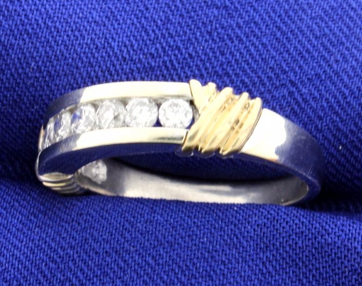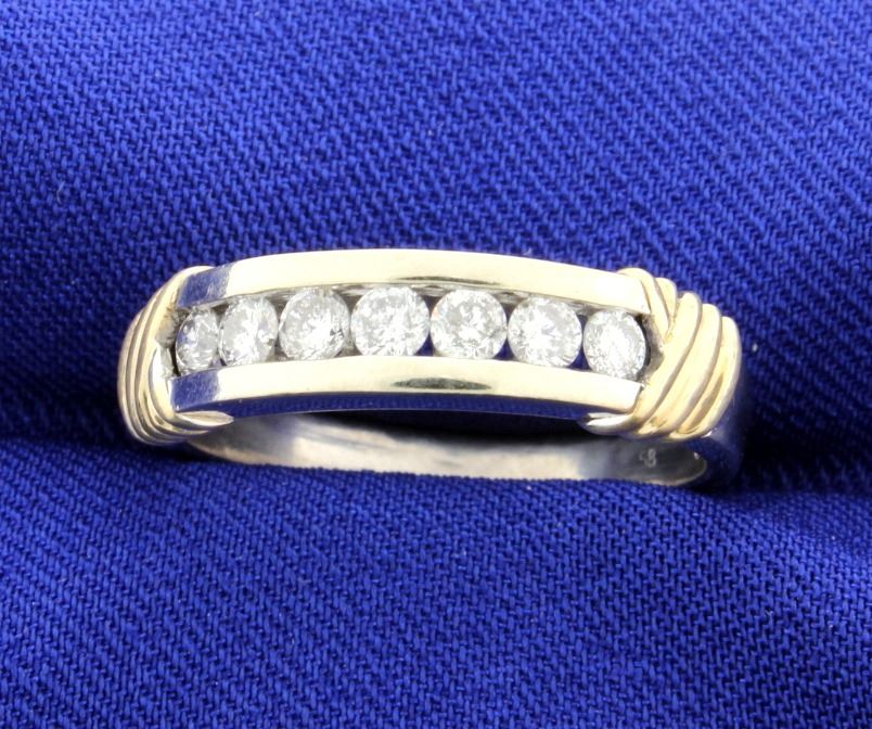 There are 7 brilliant cut diamonds that weigh a total of 0.50ct (1/2 ct). The clarity is SI2 and H-I color. The diamonds are very white and bright! The brilliant cut diamonds are channel set for good security! Size 9 Excellent Condition. 6.0g