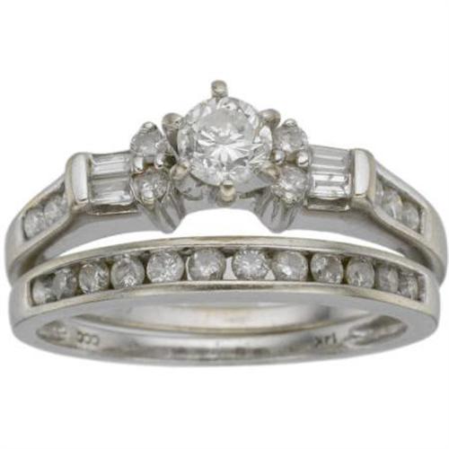 <B>Diamond, White Gold Ring Set</B></I> The set includes: one ring featuring a round brilliant-cut diamond weighing approximately 0.30 carat, enhanced by full and baguette-cut diamonds weighing a total of approximately 0.25 carat, set in 14k white gold <I>(Size 6-1/2)</B></I>; together with a matching band, featuring full-cut diamonds weighing a total of approximately 0.25 carat, channel set in 14k white gold <I>(Size 7)</B></I>. Total diamond weight for the set is approximately 0.80 carat. Gross weight for the set is 4.30 grams.<BR><BR><b>Shipping:</b> Miscellaneous Collectibles, Smal (<a target="_blank" href="http://www.heritageauctions.com/common/shipping.php">view shipping information</a>)