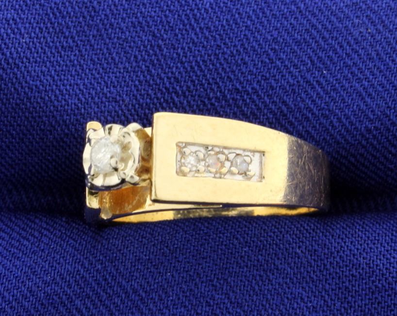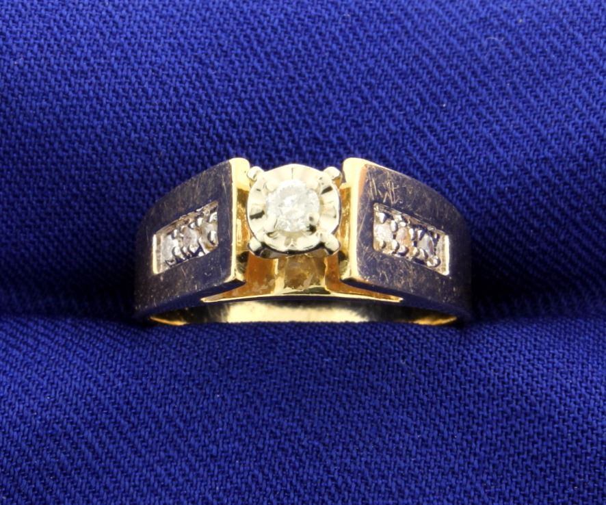 In 14k gold, there are 7 diamonds total weight 0.20ct. Clarity I1-I2 and color J-K. The ring is 7mm wide and tapers to 3.6mm. Size 7.5. 6.2g