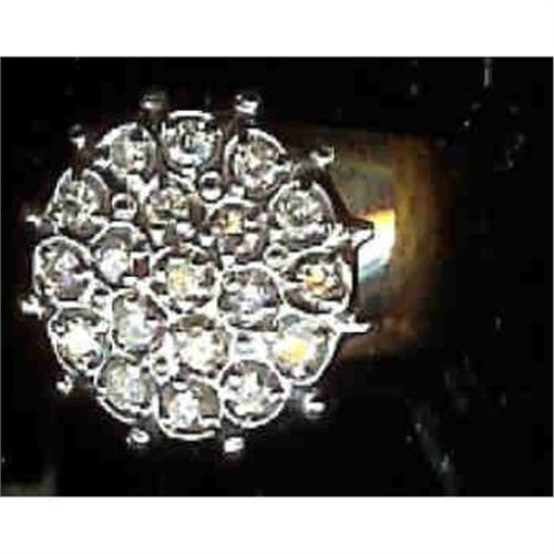 19 diamonds in a double circle with one in the middle.3/4ct total weight. High basket 3/8" hight in 14k yellow gold. Wide band 3/8" at the shoulders, 1/4" at the base of the shank yellow gold. Size 6.