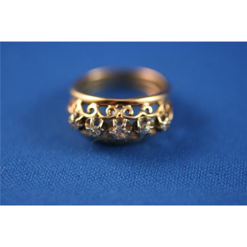 This is a lovely, pretty and unique ring from the 1940's. Lovely filigree og yellow 18K gold supports 5 european cut diamond, weighing a toal of .33 carats. This beautiful ring would make a wonderful anniversay or wedding ring as well as a great right hand ring. It is a size 6 (sizable by me or by your jeweler) and weighs 3.6 grams.