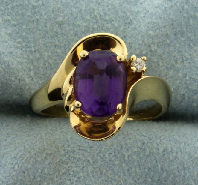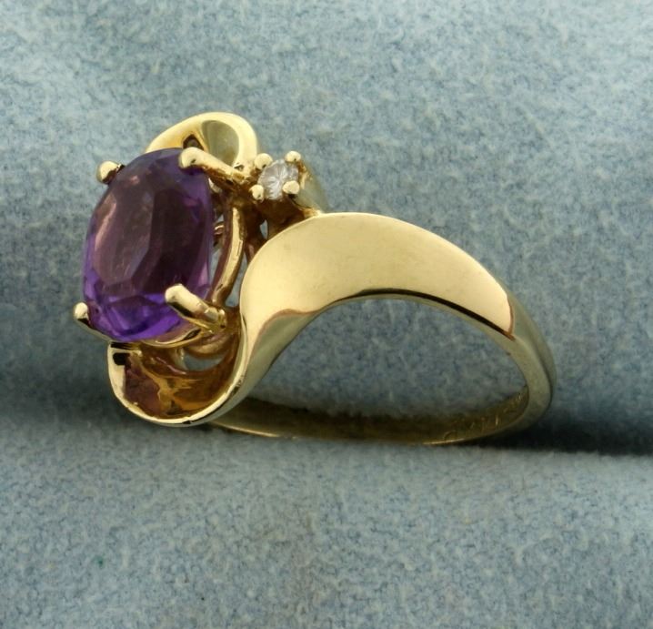 In 14k yellow gold. Contains a 8.8x7mm natural amethyst gemstone with a vibrant purple color and excellent clarity. Also contains a high quality .02ct diamond, VS clarity/H color. 5.2g.