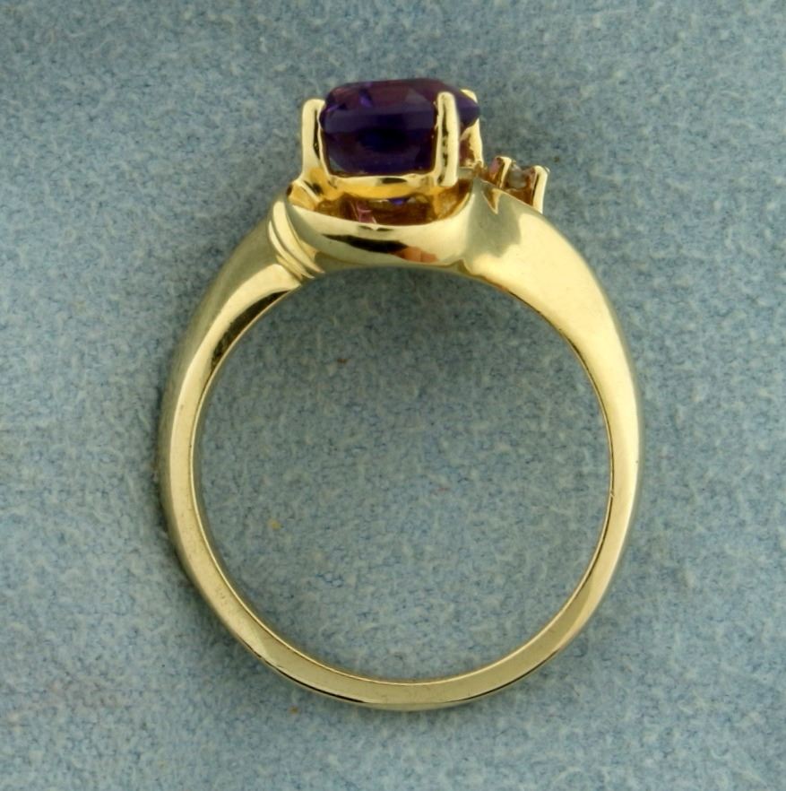 In 14k yellow gold. Contains a 8.8x7mm natural amethyst gemstone with a vibrant purple color and excellent clarity. Also contains a high quality .02ct diamond, VS clarity/H color. 5.2g.