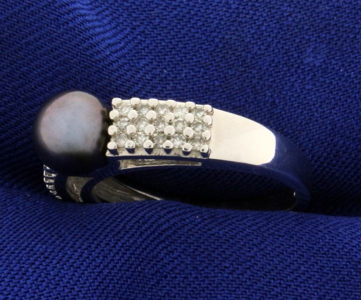 In 14k white gold. Contains a high quality 7mm black pearl with excellent color and luster, surrounded by thirty high quality .005ct diamonds. Size 7. 4.3g.