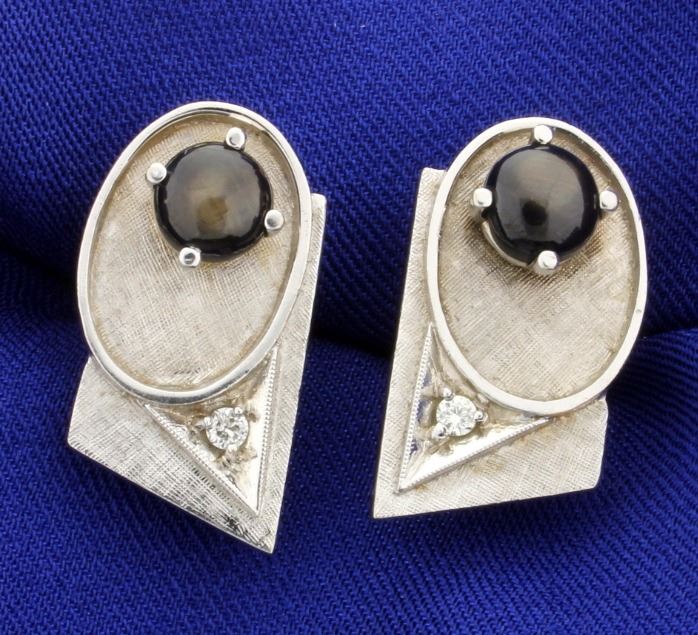 They are 14K white gold, and contain three 7mm cabochon black sapphires, also contains four .1ct diamonds, and two .05ct diamonds-all high quality VS clarity/H color. Cufflinks and tie tack are 1 inch long each. 25.0g